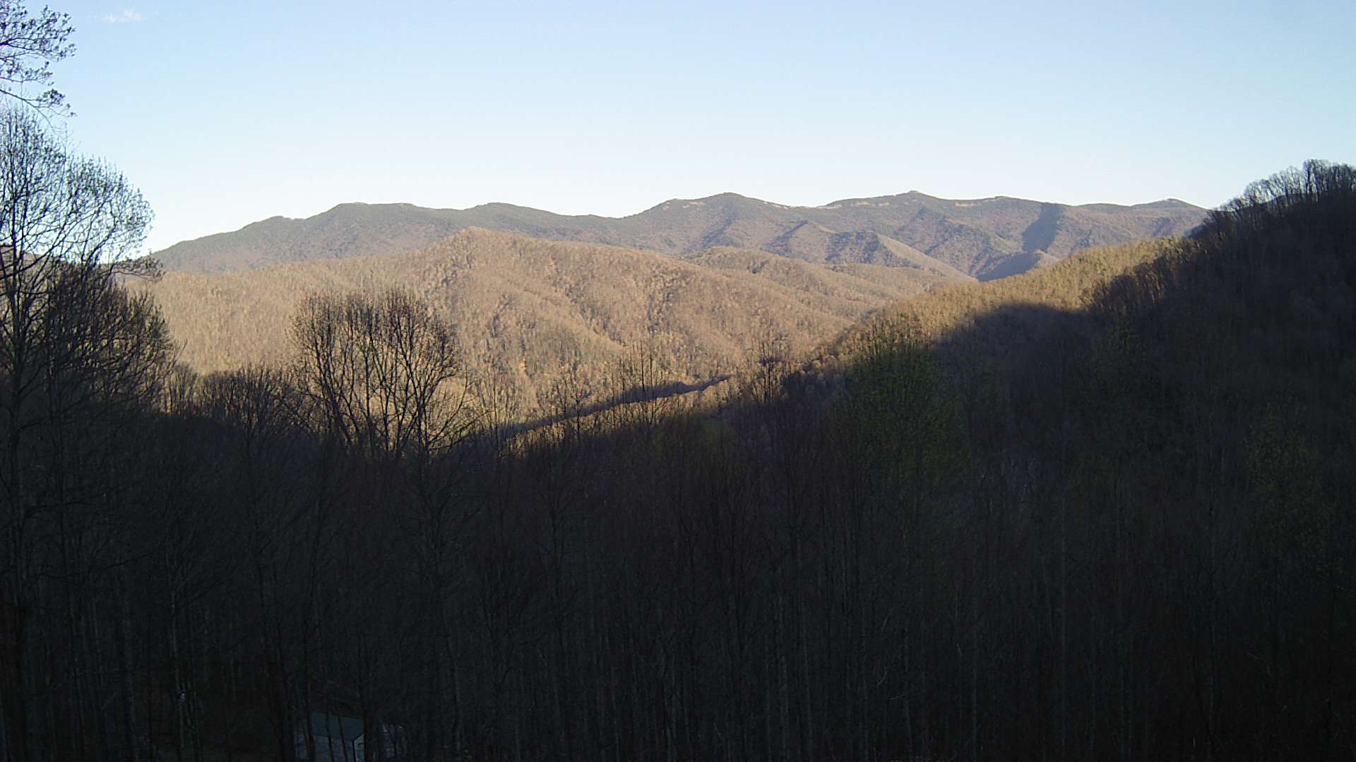 View of Mt. Mitchell and a portion of the Black Mountain Range in Yancey County, NC from a webcam positioned on the south side of Blue Knob pointing southeast. The peaks in the center of the view, from left to right, are Balsam Cone (6600 ft.), Big Tom (6526 ft.), Mt. Craig (6647 ft.), and Mt. Mitchell (6684 ft.)