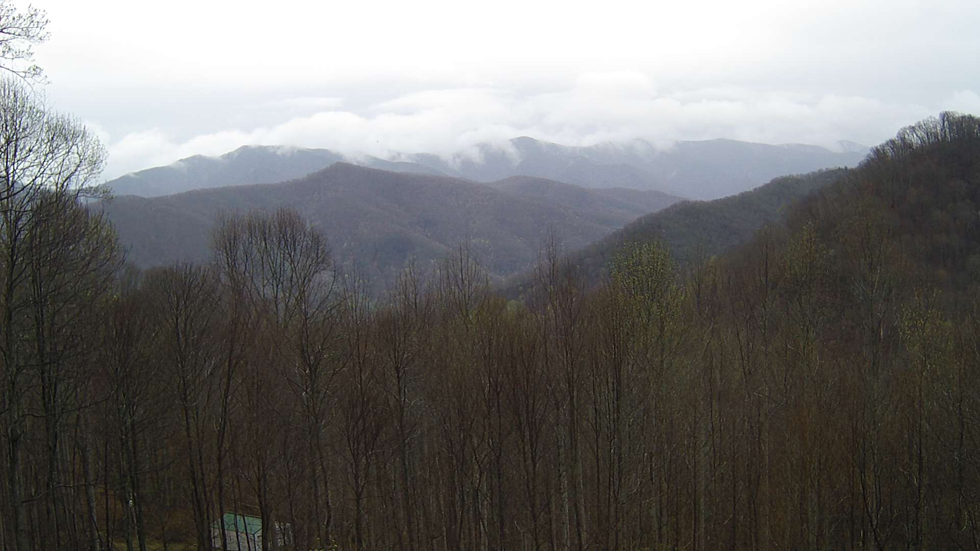 View of Mt. Mitchell and a portion of the Black Mountain Range in Yancey County, NC from a webcam positioned on the south side of Blue Knob pointing southeast. The peaks in the center of the view, from left to right, are Balsam Cone (6600 ft.), Big Tom (6526 ft.), Mt. Craig (6647 ft.), and Mt. Mitchell (6684 ft.)