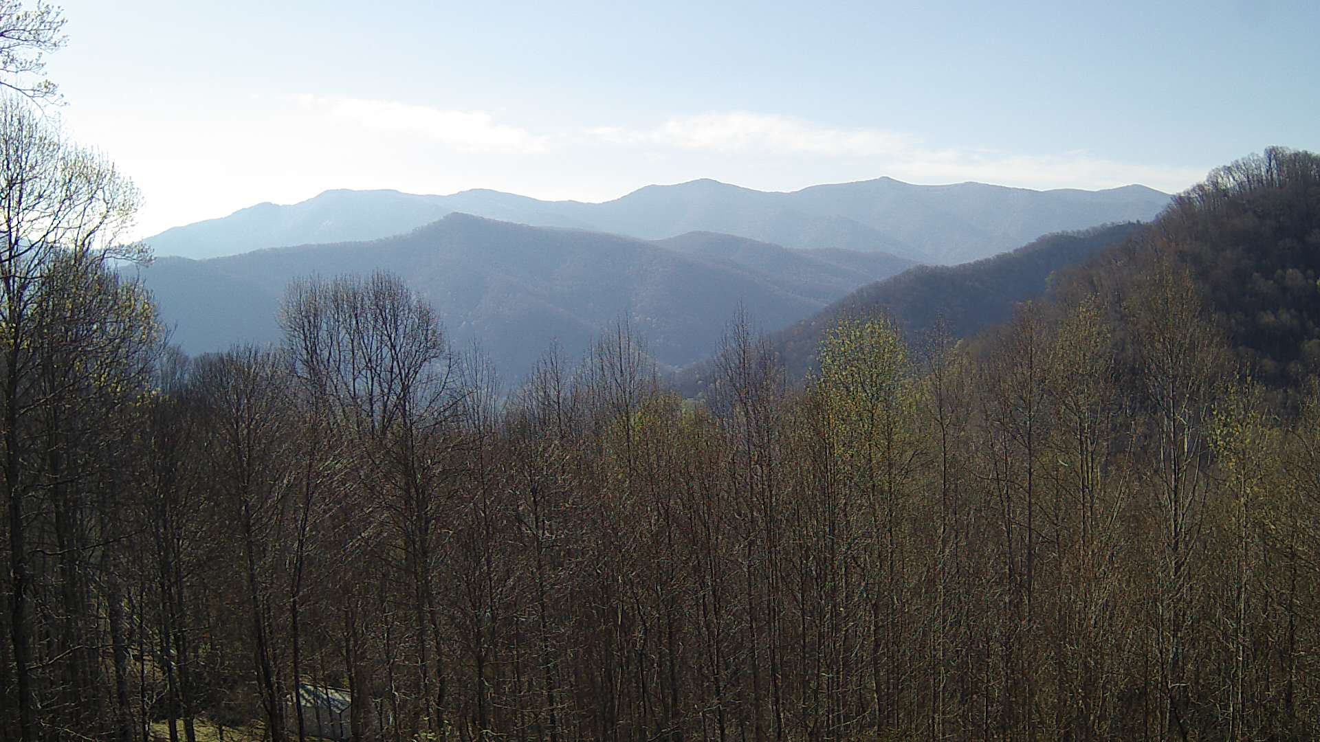 View of Mt. Mitchell and a portion of the Black Mountain Range in Yancey County, NC from a webcam positioned on the south side of Blue Knob pointing southeast. The peaks in the center of the view, from left to right, are Balsam Cone (6600 ft.), Big Tom (6526 ft.), Mt. Craig (6647 ft.), and Mt. Mitchell (6684 ft.)