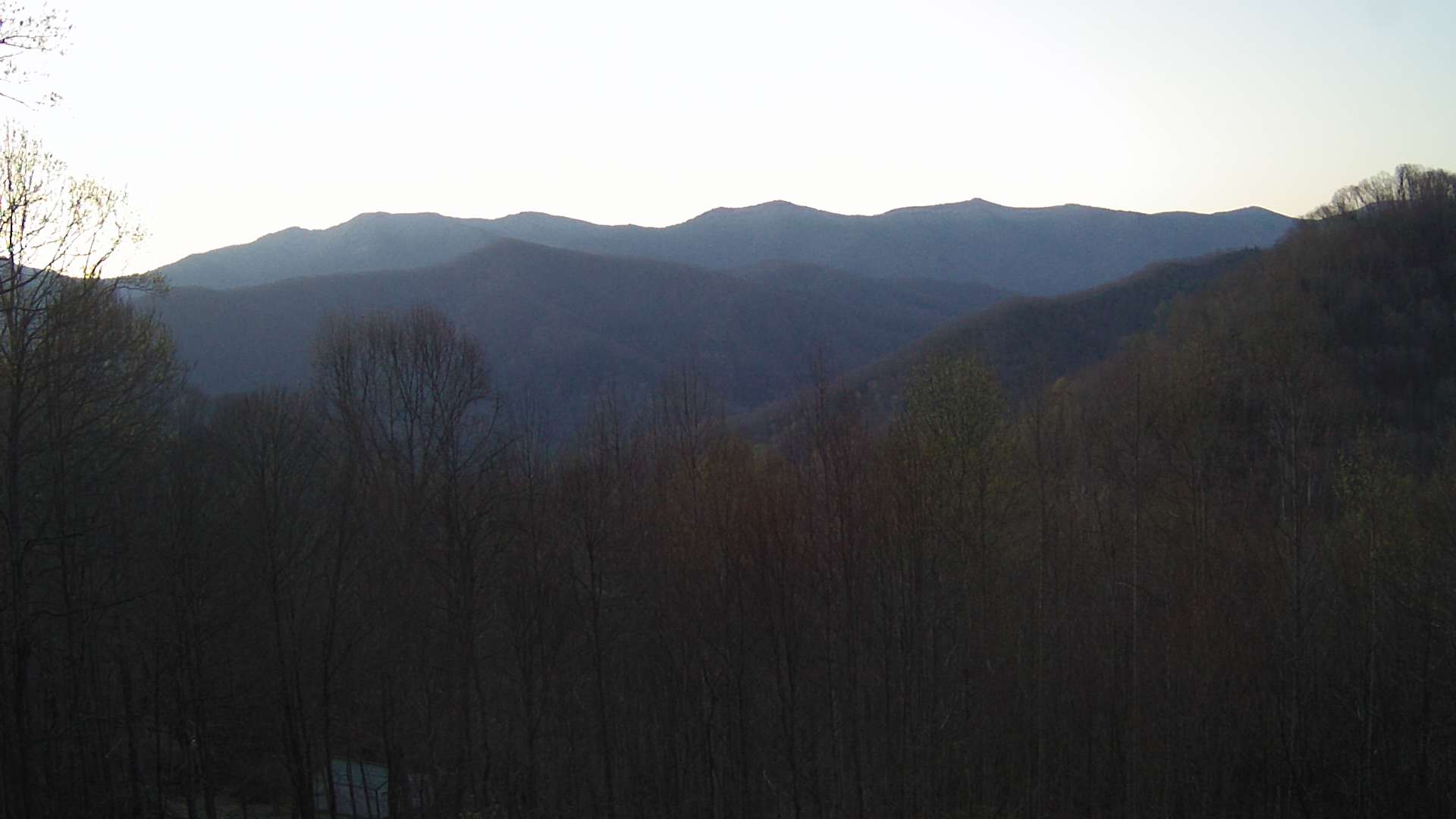 View of Mt. Mitchell and a portion of the Black Mountain Range in Yancey County, NC from a webcam positioned on the south side of Blue Knob pointing southeast. The peaks in the center of the view, from left to right, are Balsam Cone (6600 ft.), Big Tom (6526 ft.), Mt. Craig (6647 ft.), and Mt. Mitchell (6684 ft.)