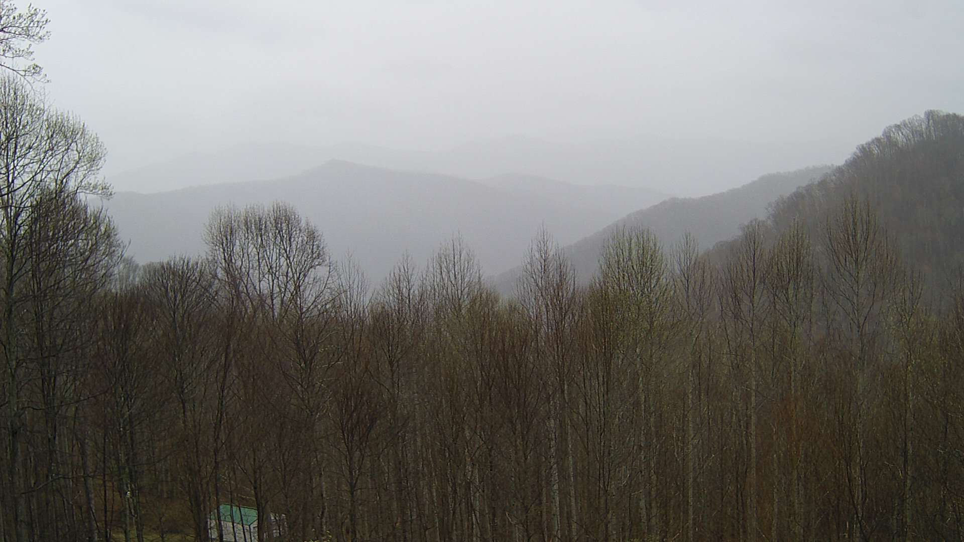 View of Mt. Mitchell and a portion of the Black Mountain Range in Yancey County, NC from a webcam positioned on the south side of Blue Knob pointing southeast. The peaks in the center of the view, from left to right, are Balsam Cone (6600 ft.), Big Tom (6526 ft.), Mt. Craig (6647 ft.), and Mt. Mitchell (6684 ft.)
